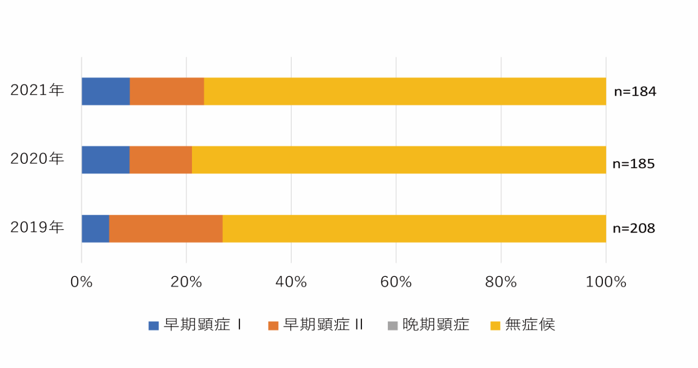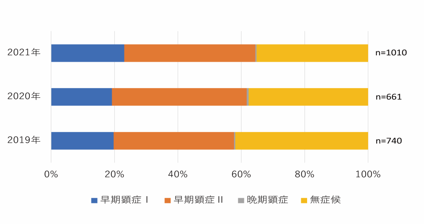 妊娠症例は、いずれの年においても無症候が70%以上(2019年 152例73%、2020年 146例79%、2021年 141例77%)を占めた(図5)。CSW症例の無症候は40%前後(2019年 310例42%、2020年 249例38%、2021年 355例35%)であったが、早期顕症は60%前後(2019年 427例58%、2020年 408例62%、2021年 651例64%)を占め、その割合は微増傾向であった(図6)。