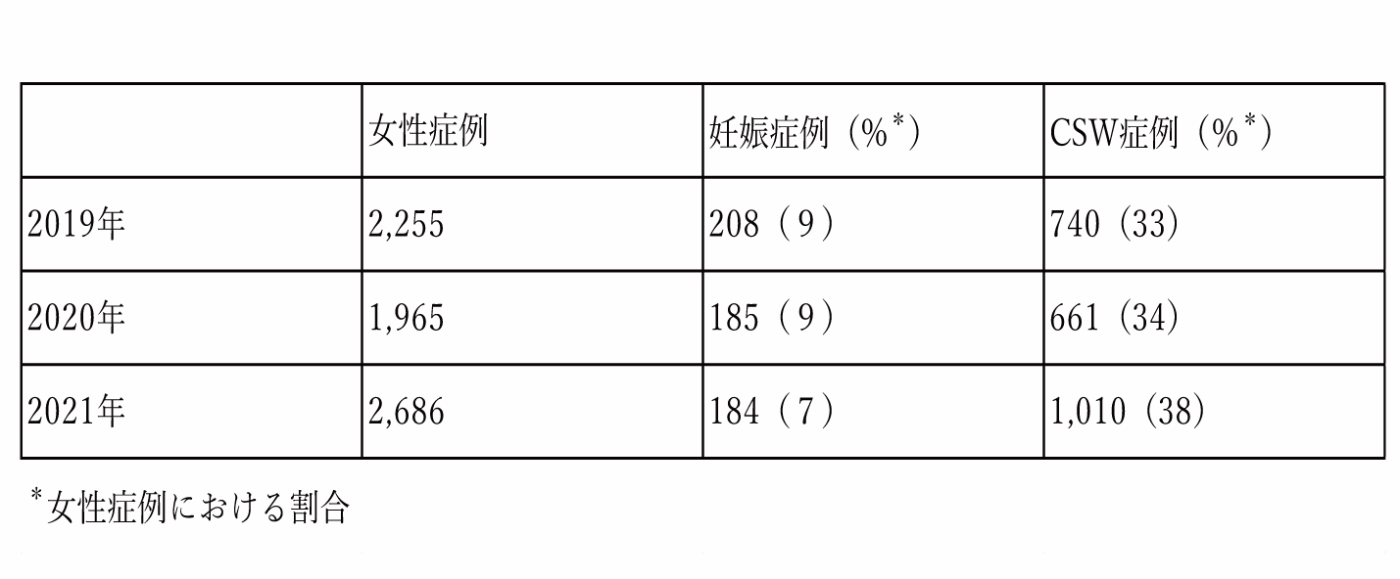 表1.梅毒女性症例、妊娠症例、女性CSW症例の報告数、2019~2021年