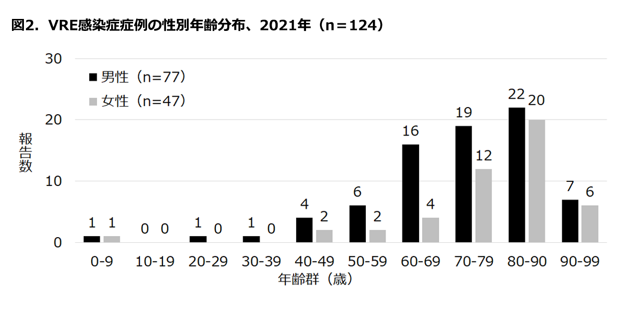 2023年2月3日現在、2021年疫学週第1週~第52週(2021年1月4日~2022年1月2日)にVRE感染症と診断され、報告された症例は124例であった(図1)。2011年以降、年間の報告数は100例未満を推移していたが、2020年は136例と過去最多となり、2021年もそれに次いで多かった。性別では、男性が77例(62%)と(図2)、過去2年間の男性の割合(約50%)より増加した。診断時年齢の中央値は78歳(四分位範囲67-85歳、範囲0-95歳)で、0歳の症例が2例あった。70歳以上の症例数は86例(69%)であり、その割合は過去2年間の約80%と比較し減少した。届出時の死亡例は1例(1%)であった。診断名(注意:)は尿路感染症32例(26%)、菌血症21例(17%)の順に多く、これらの割合は過去2年間と比較して減少傾向であった。菌が分離された検体では尿38例(31%)、血液34例(27%)で、これらの割合も過去2年間と比較し減少傾向であった(表2)。菌種の記載があったのは122例で、Enterococcus faecium 111例(90%)、Enterococcus faecalis 4例(3%)、Enterococcus casseliflavus 2例(2%)、Enterococcus gallinarum 2例(2%)の順に多く報告されており、E. faeciumの割合は過去2年間と比較し増加していた(表3)。VREのバンコマイシン耐性遺伝子の種類については25例(20%)で記載があり、内訳はvanA遺伝子が 17例(68%)、vanB遺伝子が7例(28%)、vanA遺伝子とvanB遺伝子の両方が記載されていたものが1例(4%)だった。2021年におけるVRE感染症の報告は17都道府県よりあり、特に大阪府(25例)や広島県(21例)、静岡県(17例)からの症例の報告が多かった。報告があった都道府県数は、2014年から2019年は20前後であったが、2020年は26都道府県と増加し、発生地域の広がりが懸念されたが、2021年は17都道府県と2019年以前と同程度であった。また、報告医療機関数は、2017年から2019年は60施設前後であったが、2020年の102施設に増加し、2021年は86施設であった。
