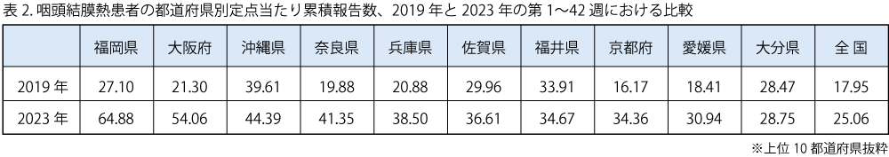 咽頭結膜熱は、感染症発生動向調査の小児科定点把握の5類感染症であり、全国約3,000カ所の小児科定点医療機関から毎週報告されている。2023年は、例年、患者報告数が減少する第33週(2023年8月14~20日)頃から増加に転じ、第42週(2023年10月16~22日)は過去10年の定点当たり報告数の中で最も多い報告数(定点当たり報告数2.16)となっている(以下、報告数等は集計時点暫定値)。年齢群別にみた2019年第1週(2018年12月31日~2019年1月6日)~第42週(2019年10月14~20日)の累積報告数との比較では、特に2歳から8歳までの小児において増加がみられる(表1)。2023年第1~42週の男女別累積報告数は、男性が42,888例(54.5%)、女性が35,798例(45.5%)であり、男性に多かった。更に、2023年第1~42週の定点当たり累積報告数を都道府県別にみると、福岡県で最も多く(定点当たり報告数64.88)、2019年第1~42週との比較では、福岡県のほか関西地域において顕著な増加がみられる(表2)。