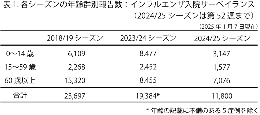 2024/25シーズン、2023/24シーズンおよびCOVID-19流行前の2018/19シーズンにおける年齢群別のインフルエンザ入院患者報告数を表1に示す。2024/25シーズンは2024年第52週までに11,800例が報告された。