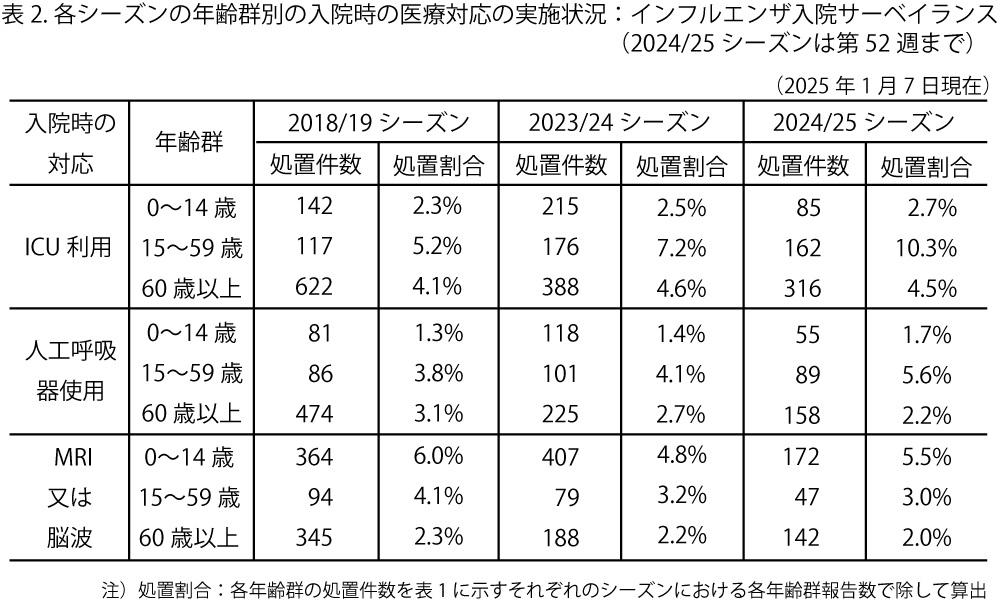 各シーズンの年齢群別の入院時の医療対応状況を表2に示す。2024/25シーズンにおける15~59歳の年齢群では、ICU利用及び人工呼吸器使用の年齢群別の処置割合は、2018/19シーズン第52週時点(ICU利用:2.4%、人工呼吸器使用2.4%)と比べ高い傾向であったが、他の年齢群はほぼ同程度であった。一方、MRI 又は脳波の年齢群別の処置割合については、2018/19シーズン第52週時点(0~14歳:6.8%、15~59歳:6.0%、60歳以上:3.2%)と比べ、全体的に低かったが、特に15~59歳の年齢群では低い傾向が認められた。