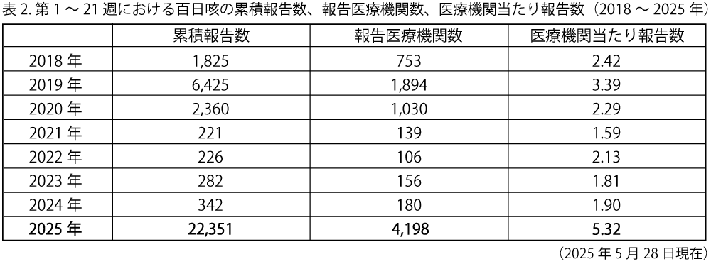 また、2018~2025年の各年で第1~21週に診断された百日咳の累積報告数、報告医療機関数、そして医療機関当たりの報告数は表2のとおりであった。