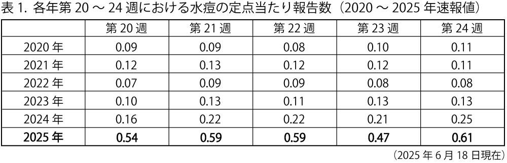 小児科定点把握対象疾患としての水痘の報告数は2020年以降、新型コロナウイルス感染症(COVID-19)の流行もあり低調であった。しかし、2025年第24週の定点当たり報告数(0.61)は、昨年同時期(0.25)、また直近で第24週の定点当たり報告数が最も高かった2019年(0.39)を大きく上回っている。また、直近5週間(第20~24週)の定点当たり報告数も過去5年間の同時期と比較して最も高い水準であった(表1)。