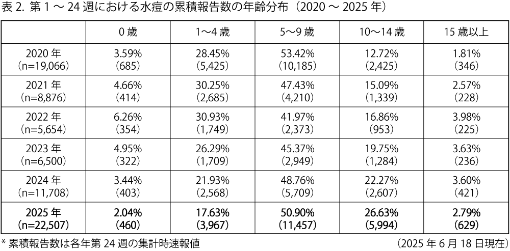 小児科定点医療機関からの報告数では、2025年第24週で1,435例であり、そのうち、男性が810例(56%)、女性が625例(44%)であった。2025年第1~24週の累積報告数は22,507例となった。年齢分布を過去5年間の第1~24週の累積報告数と比較すると、2025年は0~4歳ならびに15歳以上が占める割合が減少し、5~14歳が占める割合は増加した。2020~2025年の第1~24週における累積報告数(n)と年齢分布は表2のとおりであった。