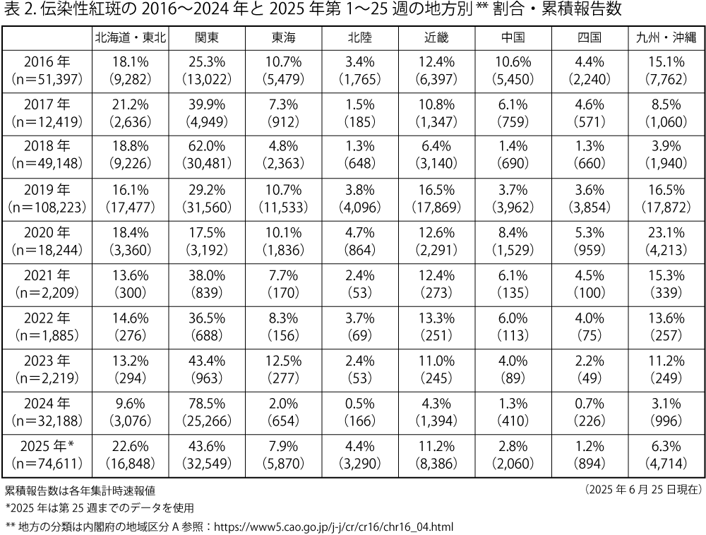 2025年第25週における都道府県別の定点当たり報告数は、多い順に山形県(7.62)、群馬県(7.32)、栃木県(7.26)、長野県(6.04)、富山県(5.38)であった。2025年第1~25週までの定点当たり累積報告数は、多い順に栃木県(70.87)、山形県(70.32)、福島県(61.62)、富山県(51.64)、北海道(51.08)であった。一方、少ない順には徳島県(3.59)、岡山県(4.57)、香川県(5.67)、鹿児島県(7.80)、山口県(7.88)であり、特に関東以北での定点当たり報告数が高かった。地方別の経年的な流行状況の推移としては、流行に先駆けて関東地方で定点当たり報告数が増加し、流行年に他地方に拡大する傾向を認めた。2024年秋以降の定点当たり報告数の増加においても、関東地方における増加が先行し、その後、全国的な増加が見られている。2025年第25週時点で関東地方に次いで多いのは北海道・東北地方である(表2)。