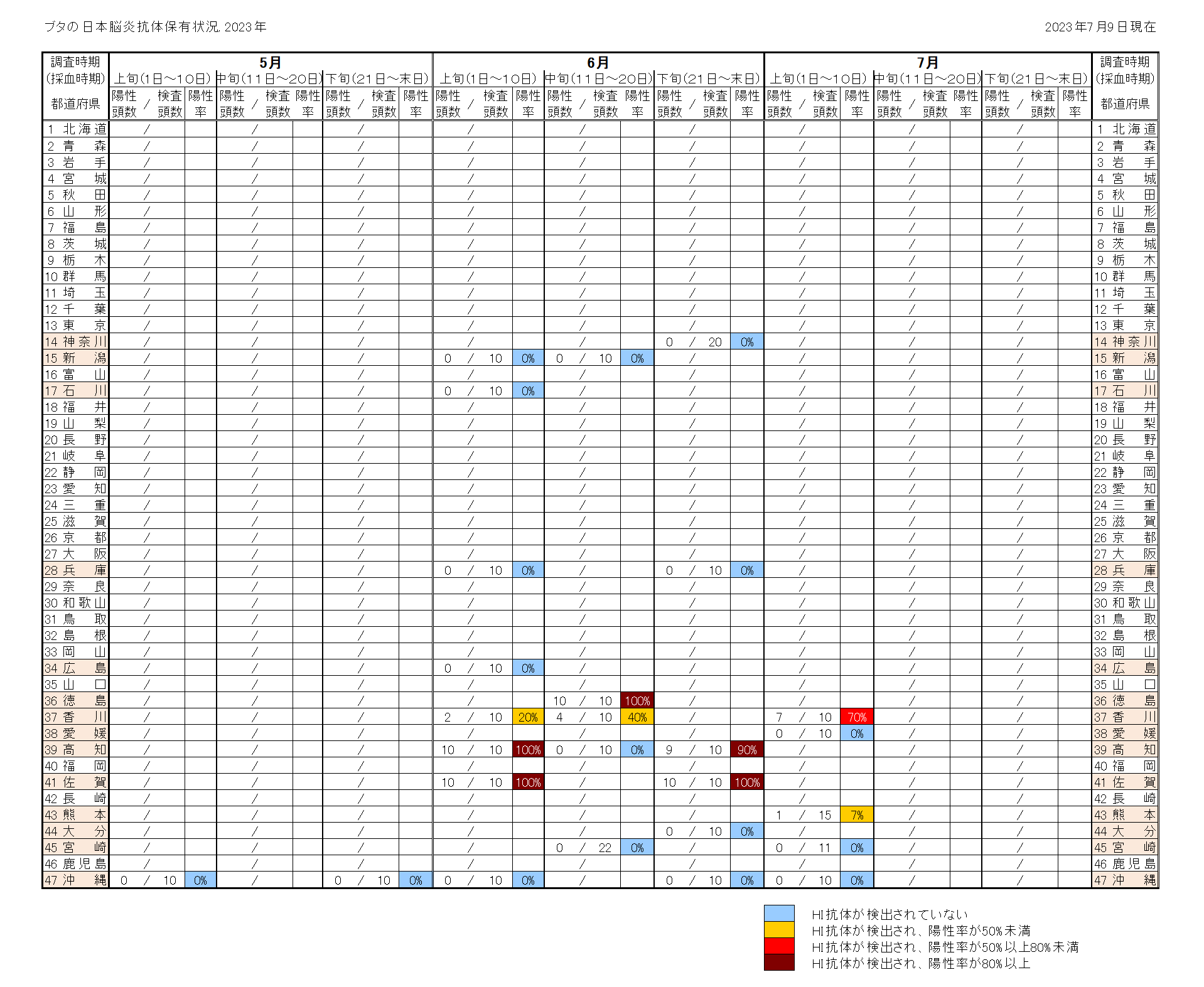 感染症流行予測調査事業では、全国各地のブタ血清中のJEVに対する抗体保有状況を赤血球凝集抑制法(Hemagglutination inhibition test:HI法)により測定し、JEVの蔓延状況およびウイルスの活動状況を調査している。前年の秋以降に生まれたブタがJEVに対する抗体を保有し、さらに2-メルカプトエタノール(2-ME)感受性抗体(IgM抗体)を保有している場合、そのブタは最近JEVに感染したと考えられる。下表は本年度の調査期間中におけるブタの抗体保有状況を都道府県別に示しており、JEVに最近感染したブタが認められた地域を青色、それに加えて調査したブタの50%以上に抗体保有が認められた地域を黄色、80%以上に抗体保有が認められた地域を赤色で示している。
