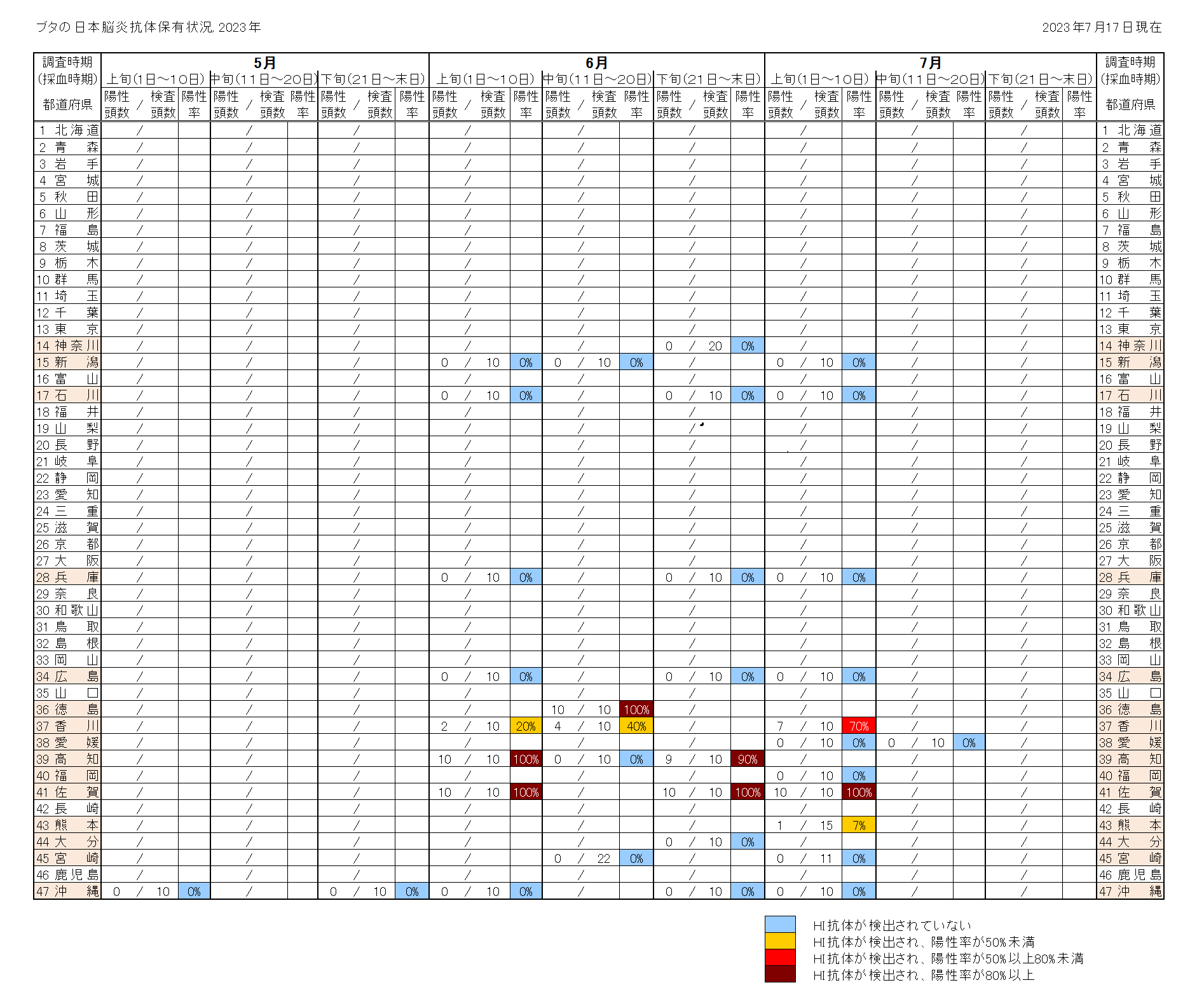 感染症流行予測調査事業では、全国各地のブタ血清中のJEVに対する抗体保有状況を赤血球凝集抑制法(Hemagglutination inhibition test:HI法)により測定し、JEVの蔓延状況およびウイルスの活動状況を調査している。前年の秋以降に生まれたブタがJEVに対する抗体を保有し、さらに2-メルカプトエタノール(2-ME)感受性抗体(IgM抗体)を保有している場合、そのブタは最近JEVに感染したと考えられる。下表は本年度の調査期間中におけるブタの抗体保有状況を都道府県別に示しており、JEVに最近感染したブタが認められた地域を青色、それに加えて調査したブタの50%以上に抗体保有が認められた地域を黄色、80%以上に抗体保有が認められた地域を赤色で示している。