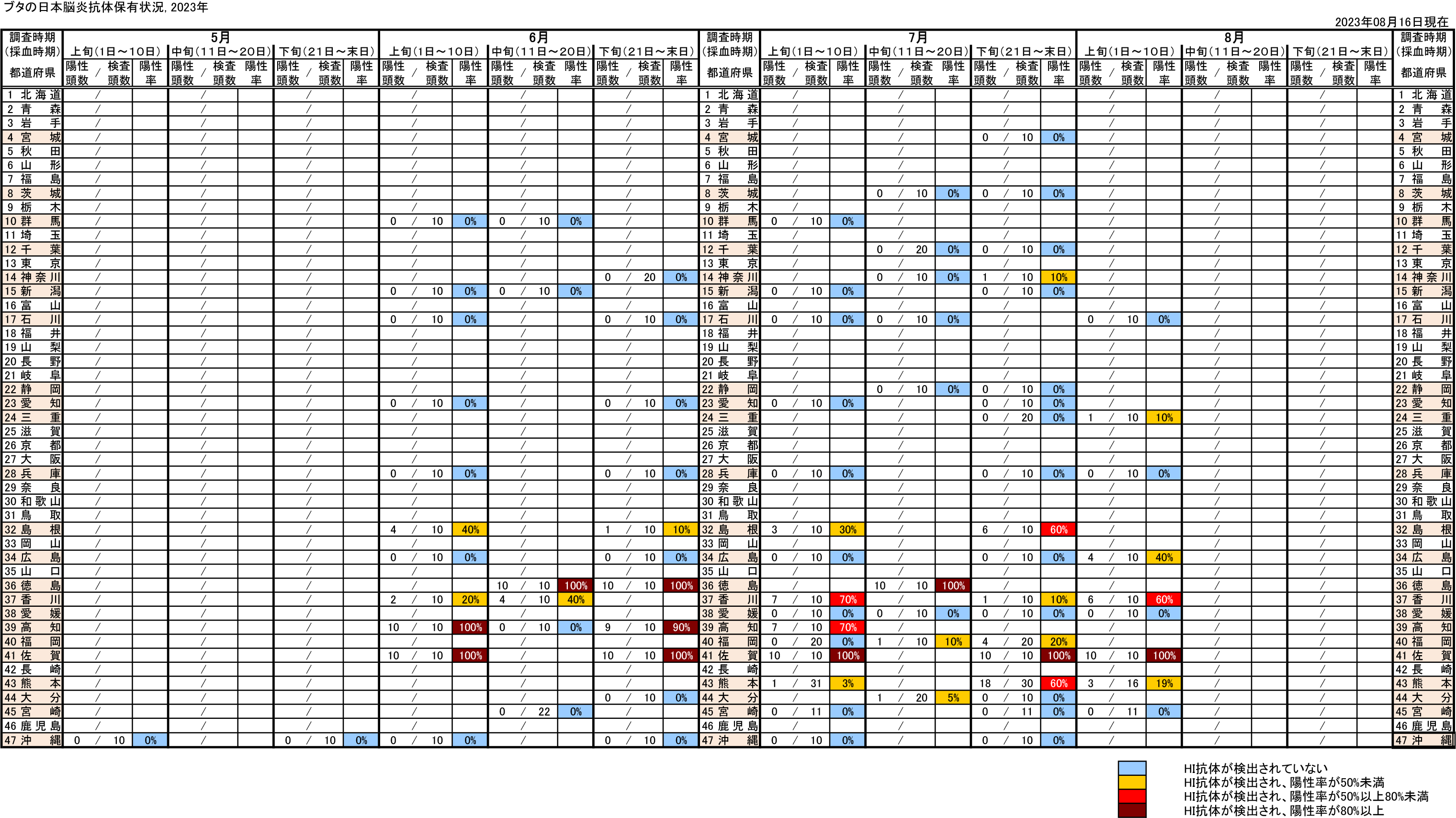 感染症流行予測調査事業では、全国各地のブタ血清中のJEVに対する抗体保有状況を赤血球凝集抑制法(Hemagglutination inhibition test:HI法)により測定し、JEVの蔓延状況およびウイルスの活動状況を調査している。前年の秋以降に生まれたブタがJEVに対する抗体を保有し、さらに2-メルカプトエタノール(2-ME)感受性抗体(IgM抗体)を保有している場合、そのブタは最近JEVに感染したと考えられる。下表は本年度の調査期間中におけるブタの抗体保有状況を都道府県別に示しており、JEVに最近感染したブタが認められた地域を青色、それに加えて調査したブタの50%以上に抗体保有が認められた地域を黄色、80%以上に抗体保有が認められた地域を赤色で示している。